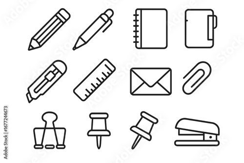 Office supplies linear icon set, essential stationery outline icons collection, vector cartoon illustration with transparent background, organized office tools symbols, stationery elements set