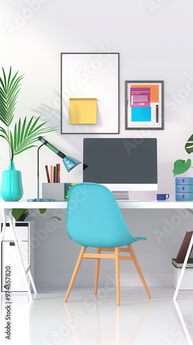 office workspace desk computer monitor lamp plant chair wall art decor stationery organized modern minimalist interior home office productivity work environment