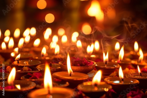 Oil lamps or diyas illuminating colorful flower petals during diwali festival celebration