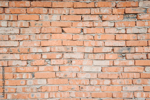 old brick wall, red and white colour, broken bricks, peeling plaster, vintage texture, background for banner, copy space