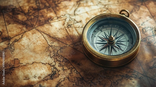 Old compass resting on a worn map, signifying exploration, adventure, and the history of navigation.