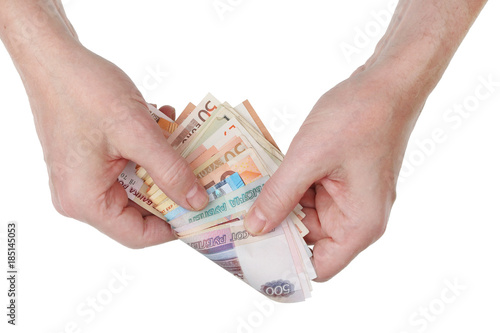 Old elderly grandfather recounts his pension savings in foreign currency.