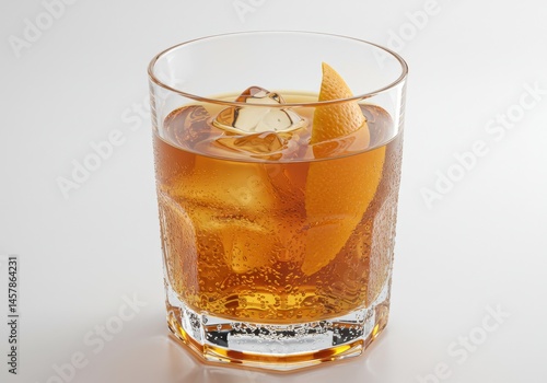 Old fashioned cocktail with ice and orange peel garnish on white background