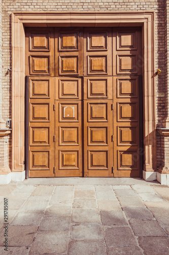 Old fashioned front double doors, all in dark brown colors. Beautiful stone door platband and wooden panels on doors