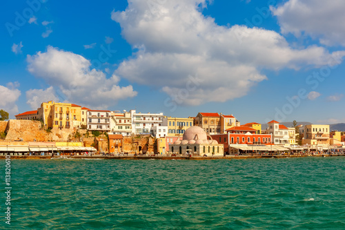 Old harbour of Chania with Venetian quay and Kucuk Hasan Pasha Mosque in the sunny morning, Crete, Greece