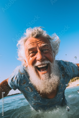 old man with gray hair, grandpa, swimming and splashing in the sea, water, joyful smiling face, happy and fun on vacation. Retirement planning. High quality photo