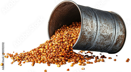 Old metal bucket tipped over spilling golden popcorn kernels across a white background in a playful display of texture and color