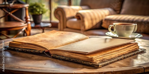 Old notebook with worn cover and yellowed pages opened on the last page of a story, coffee table