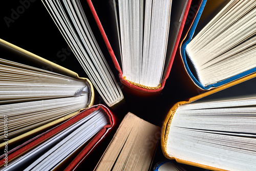 Old used hardcover books, the ends of the books background. View from above. Copy space for text.
