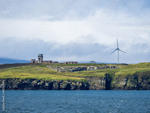 Old wartime coastal defense bunkers beside modern wind turbine on the shore of Orkney, Scotland
