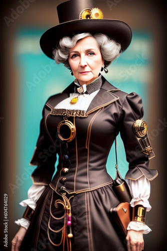 Older Gray Haired Steampunk Woman in Large Hat and Dress Generative AI illustration