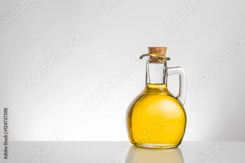 olive oil container bottle with stopper on grey gradient background