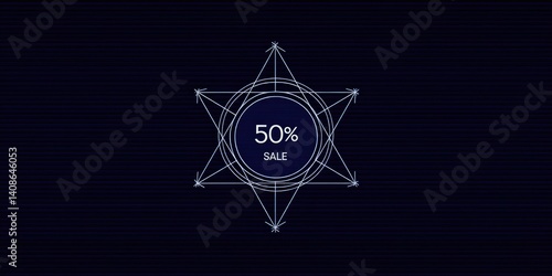 On dark blue background glowing white geometric star in circle with the text ‘50%’ and ‘SALE’ for modern sale promotions, abstract discount offers and futuristic marketing.