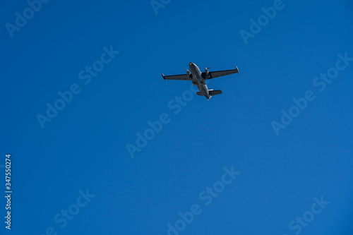 One aircraft of russian air forces is flying at airshow on bright blue sky
