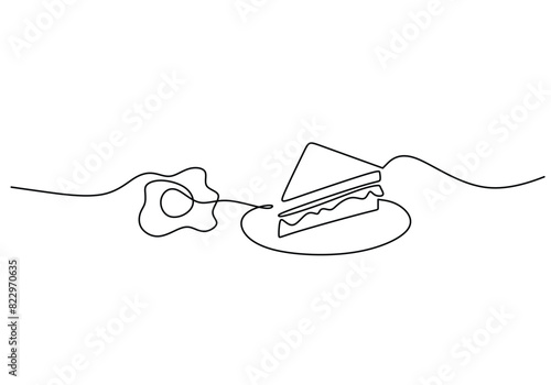 one continuous line drawing of egg and sweet cake on plate isolated on white background.