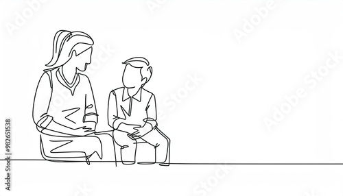 One continuous line drawing young mother talking with her son about goal and purpose of life at home, family life. Happy parenting concept.