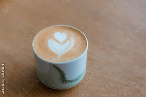 One Cup of cappuccino with latte art. Coffee in white cup on brown wooden table in cafe. Concept of easy breakfast.