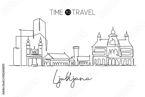 One single line drawing of Ljubljana city skyline, Slovenia. Historical town landscape in world. Best holiday destination home wall decor print. Trendy continuous line draw design vector illustration