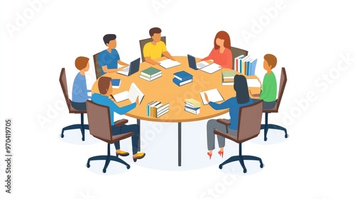 Online library concept with paper people in a business meeting, flat vector style, educational theme, isolated on white, no logo.