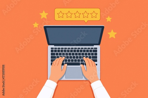 Online Review Concept: Hands Typing on Laptop with Positive Feedback, Stars, Rating on Orange Background