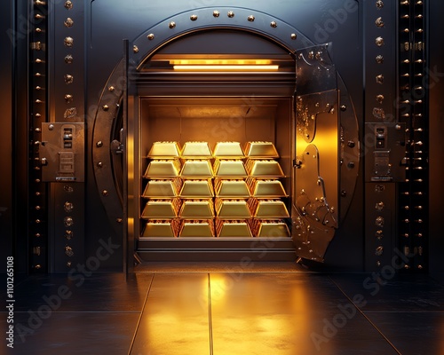 Open bank vault door revealing gleaming gold bars stacked inside, secure and luxurious design, ultrarealistic 3D render