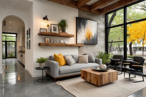Open concept modern living room with grey sofa, black metal chairs, wooden floating shelves, colorful wall art, concrete floor, and natural light