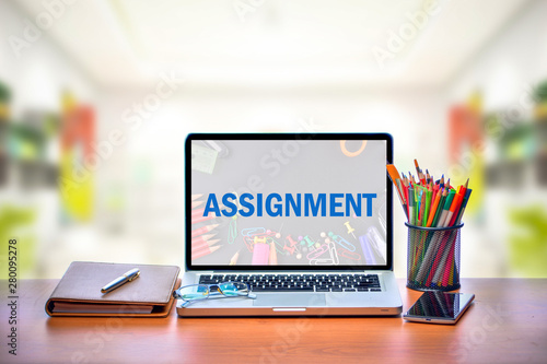 Open laptop with isolated white screen on old wooden desk with text ASSIGNMENT