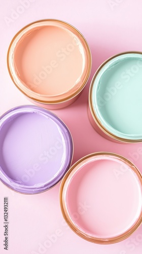 open metallic cans of wall paint in trendy pastel colors for spring redecor, pastel color solid background