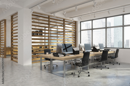 Open office interior with plank walls