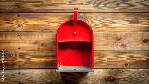 Open red letter box with mail visible against a wooden backdrop, space for text
