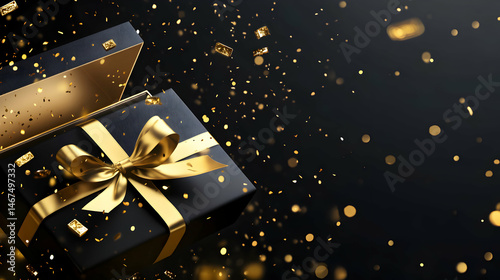 Opulent gift presentation featuring a black box with golden bow and confetti