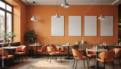 Orange cafe interior with empty posters on wall. Mock up, 3D Rendering