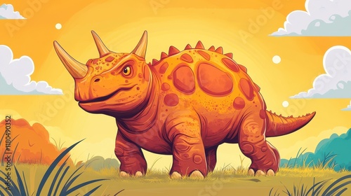 Orange Dinosaur Standing in Grassy Field at Sunset
