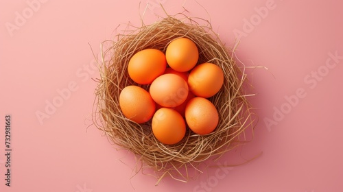 Orange Easter Egg Nest Flat Lay Whimsical Nest Filled with Vibrant Orange Eggs on a Soft Pink Background