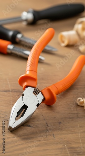 Orange Handle Pliers on Wooden Table.