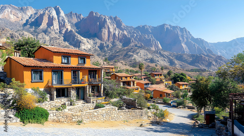 Orange houses in mountain valley