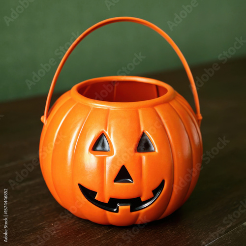 Orange jack o lantern candy bucket with a handle sits on a wooden surface