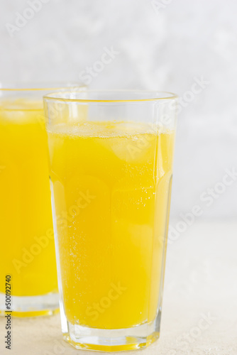 Orange lemonade in glasses on a light table.