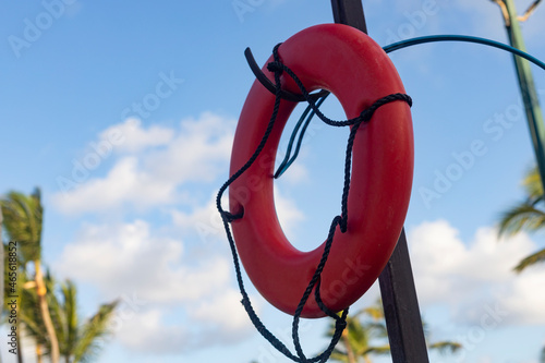 ORANGE LIFEGUARD HANGED FROM POST IN BEACH AREA