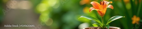Orange lily stem and leaves on a terracotta pot, garden, isolated, stem