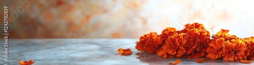 Orange marigold flowers on a gray surface with blurred background.