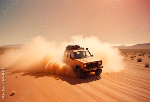 Orange offroad 4x4 vehicle running in a sand desert with dust, drifting, orange sky