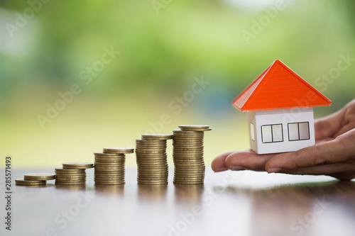 Orange roof house in investor's hand Placed close to the medallion, increasing the number of coins. Real estate investment concept, saving and buying houses, mortgage and bank loans.