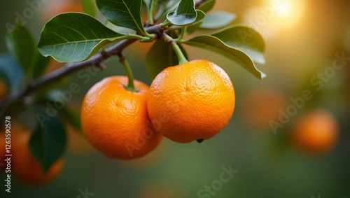 Orange trees with ripe fruits. Bloomy orange garden.