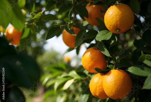Orange trees with ripe fruits. Bloomy orange garden.