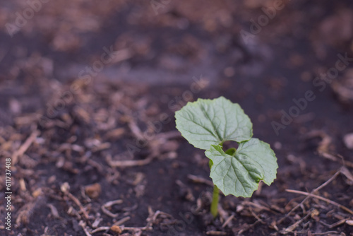 Organic Bitter melon sapling, Bitter Gourd Seedling in Pot on Blur Brown Soil Background