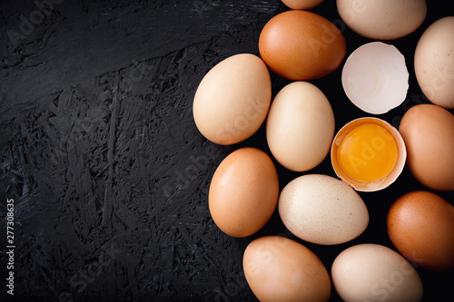 Organic chicken eggs on top of dark wooden background.