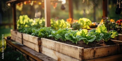 Organic farming, salad farm. harvest vegetables into wooden boxes in rainy. vegetable grow naturally. greenhouse garden