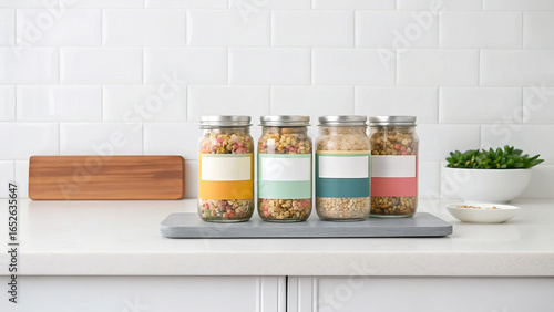 Organic granola concept ,Minimalist kitchen counter with labeled glass jars filled with colorful ingredients, creating