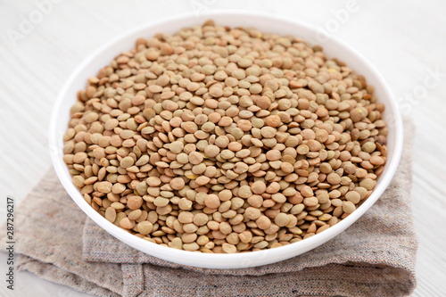 Organic green lentils in a white bowl on a white wooden background, low angle view. Close-up.